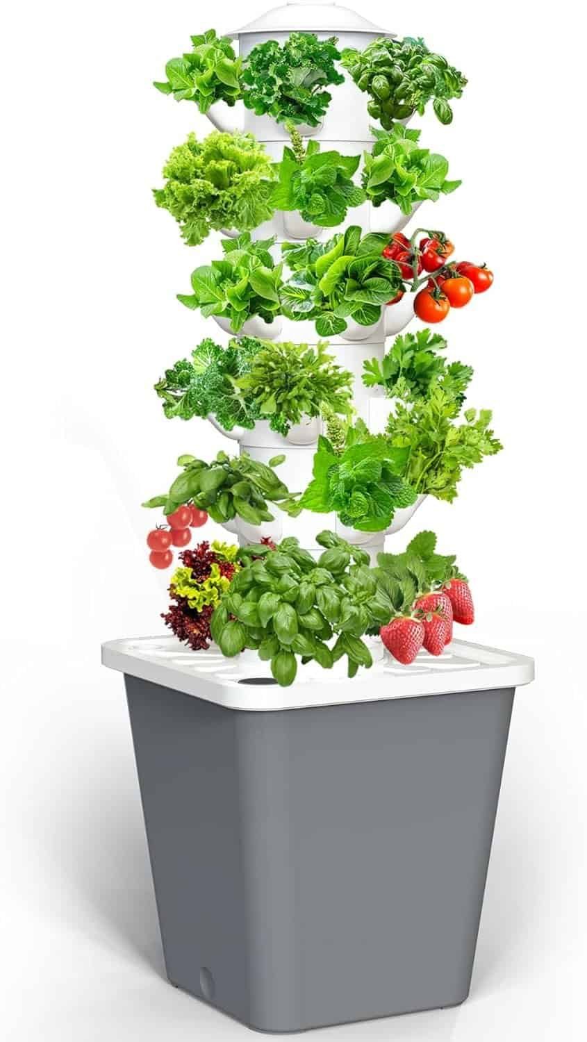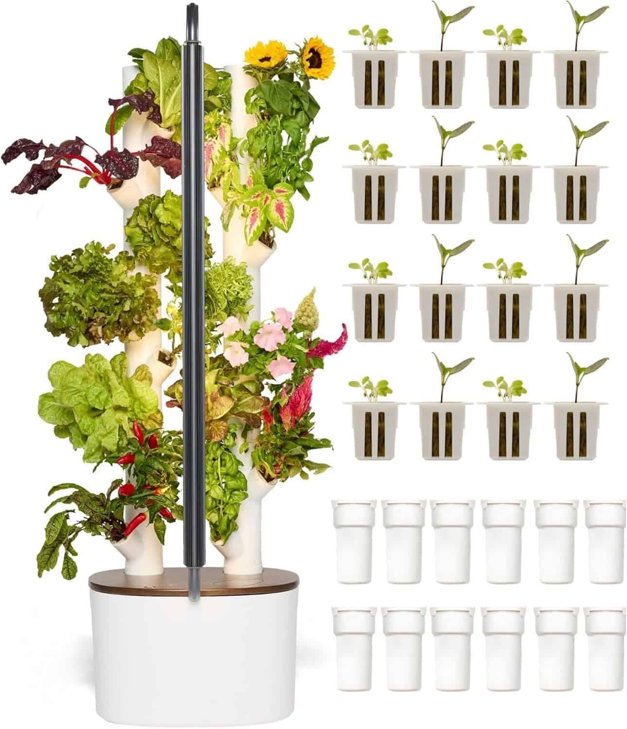 Grows 16 non-GMO plants at once with LED grow lights. A complete indoor tower garden kit ready to use.