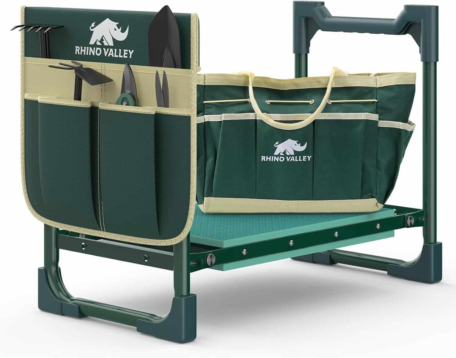 Heavy duty foldable bench with tool bags on both sides. Relieves knee and back pain during garden work.